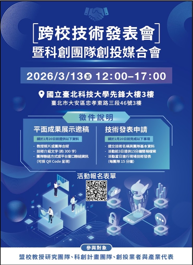 • 活動現場將規劃平面成果展示區與實體技術發表場次,呈現各校具產業應用潛力之研發成果,並邀請創投業者與產業代表到場觀覽與交流。
