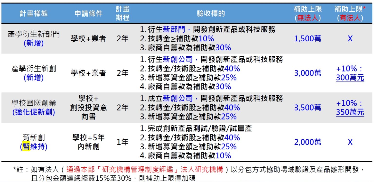 以多元產業化路徑加速學校研發成果落地,並引導產業早期參與,共同促成「新部門」或「新創公司」,從而落實推動新興科技產業發展目標。