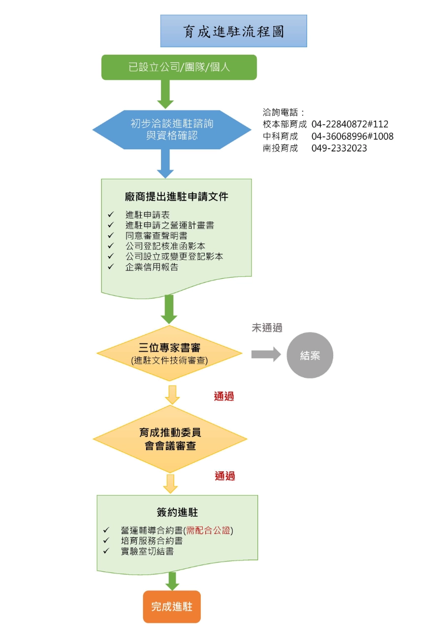 五、廠商通過審查後,創業育成組提供營運輔導合約書、培育服務合約書、實驗室切結書,請廠商用印後送學校用印,再將此份合約進行公證後完成簽約進駐。